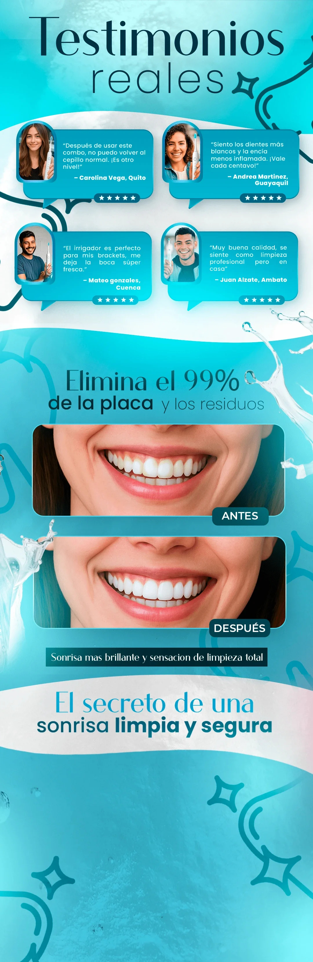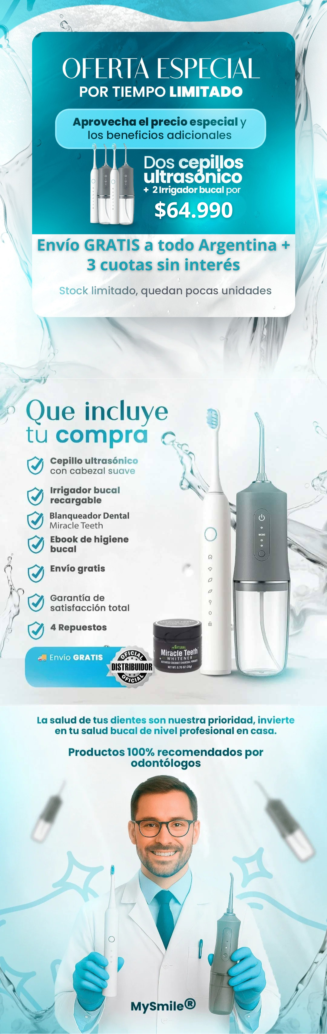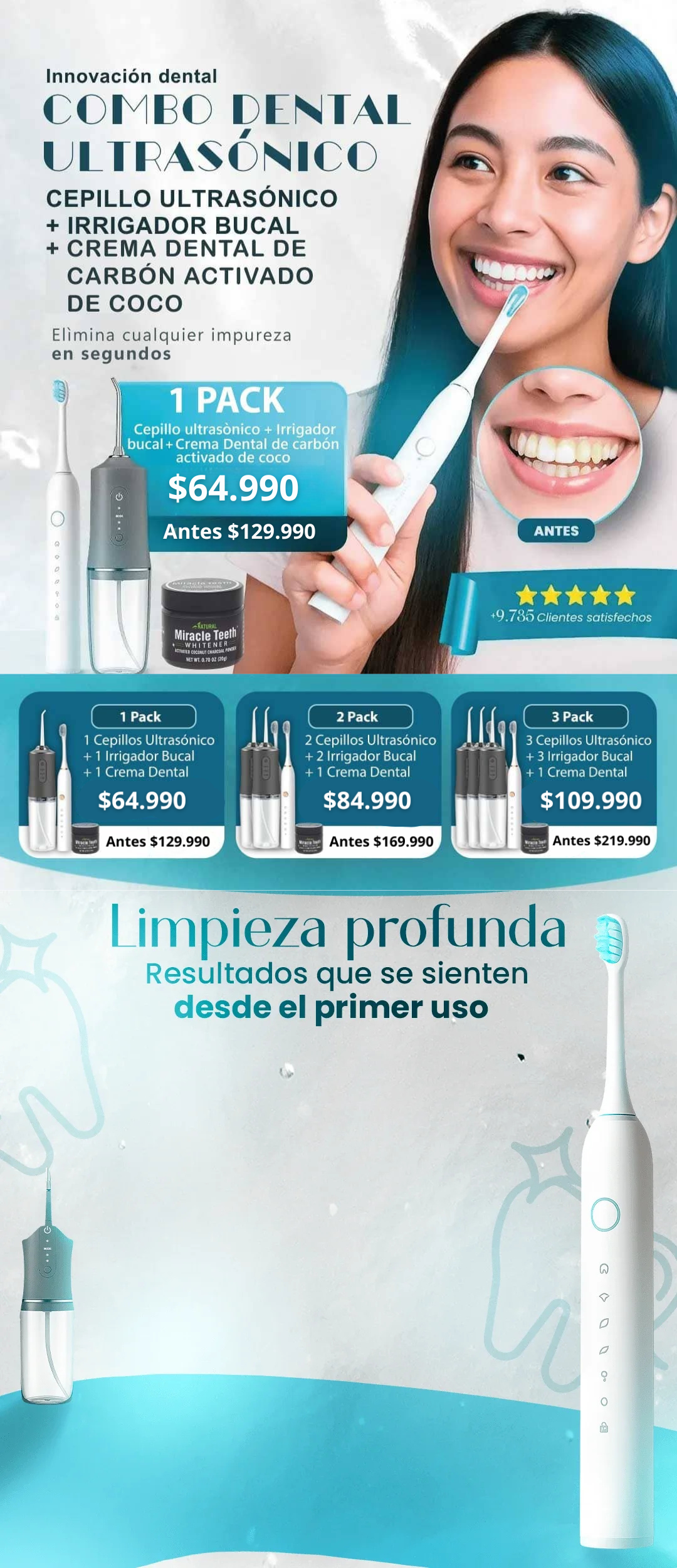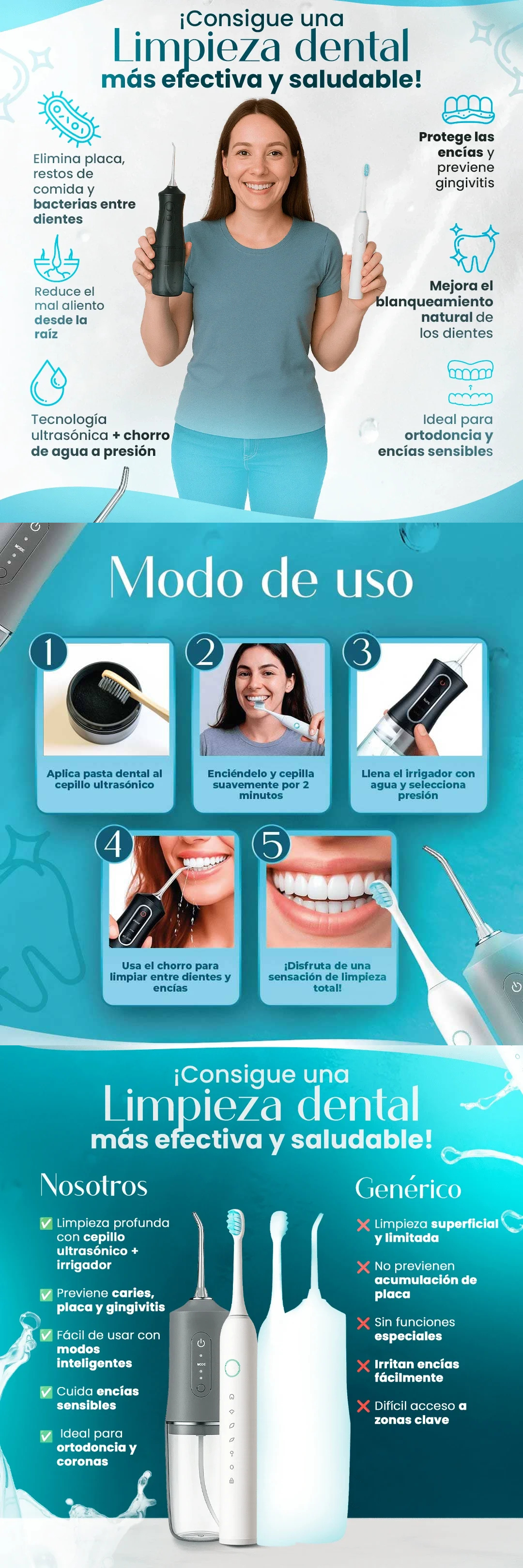 COMBO LIMPIEZA DENTAL: CEPILLO ULTRASÓNICO + IRRIGADOR BUCAL + CREMA DE CARBÓN DE REGALO!